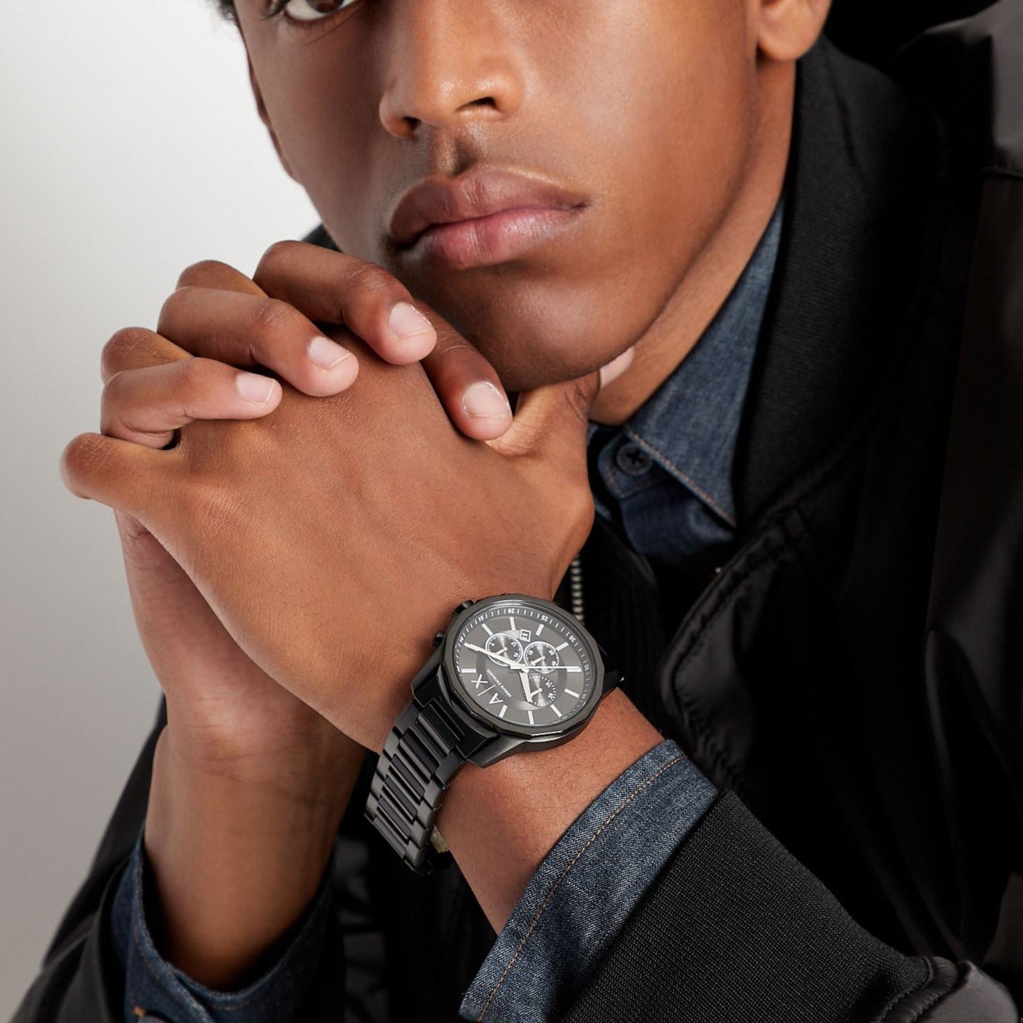 Elevate your style with the sleek and sophisticated Armani Exchange Banks Chronograph watch. This watch features a striking black dial and a durable black steel strap that exudes confidence and elegance. With its precise chronograph function, you'll stay on top of your schedule while making a fashion statement. Make a statement with this timeless timepiece!