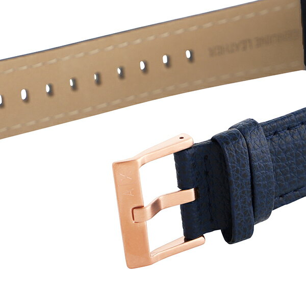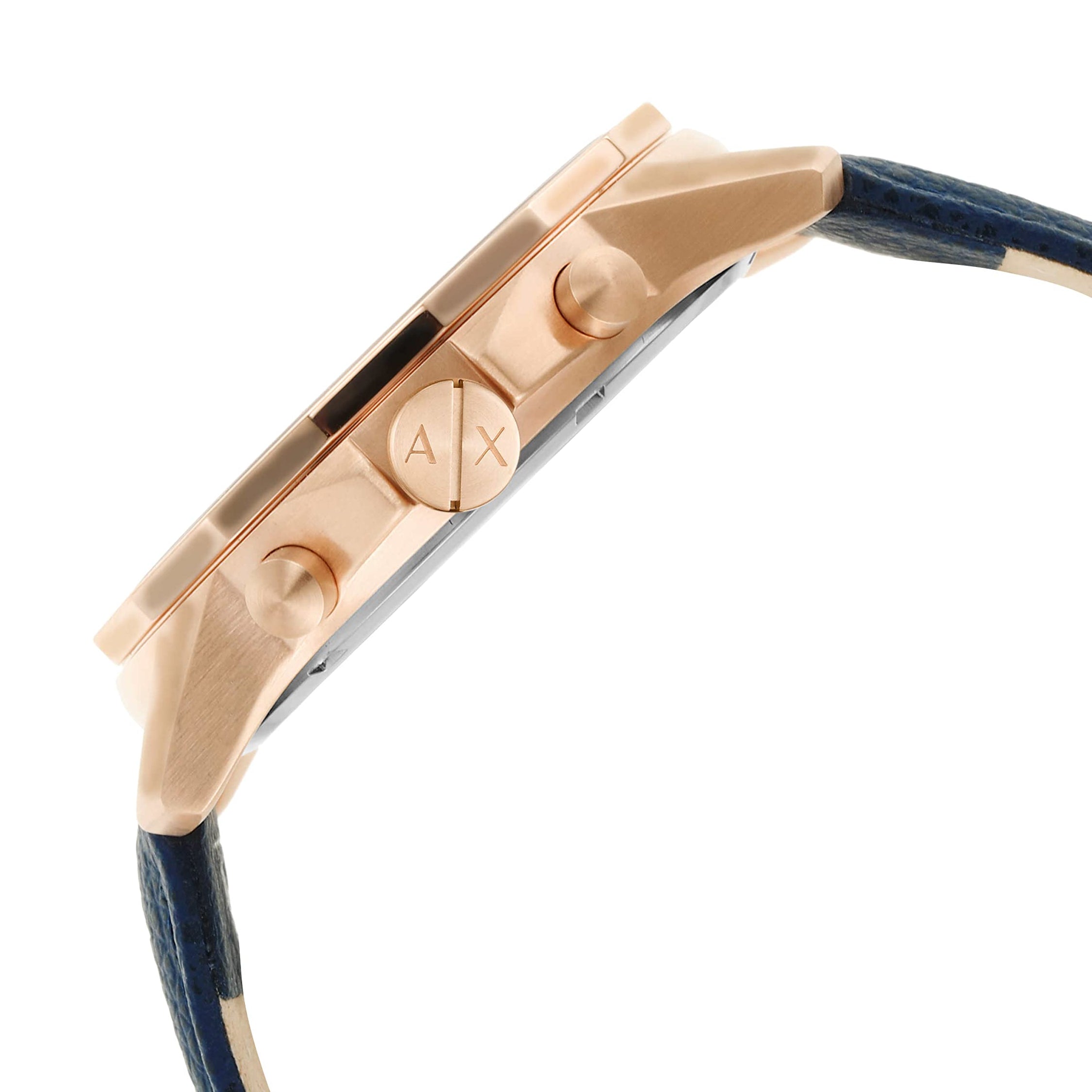• Armani Exchange's 44mm watch features a blue cd texture and sunray dial with rose gold-tone stick indexes, chronograph movement and blue leather strap.