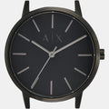 Black PVD stainless steel case and bracelet. Fixed black PVD bezel. Black dial with black hands and index hour markers. The Armani Exchange logo appears below the 12 o'clock position. Dial Type: Analog. Quartz movement. Scratch resistant mineral crystal. Solid case back. Round case shape. Case size: 42 mm. Case thickness: 8 mm. Band width: 20 mm. Deployment clasp. Water resistant at 50 meters / 165 feet. Functions: hour, minute, second. Casual watch style. Armani Exchange Cayde Black Dial Men's Watch AX2701.