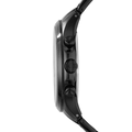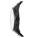 Black PVD stainless steel case and bracelet. Fixed black PVD bezel. Black dial with gunmetal hands and index hour markers. Minute markers around the outer rim. The Armani Exchange logo appears at the 12 o'clock position. Dial Type: Analog. Chronograph - three sub-dials displaying: 60 second, 60 minute and 1/10th of a second. Quartz movement.