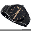 Black-plated stainless steel case with a black-plated stainless steel bracelet. Fixed black-plated bezel. Black dial with gold-tone hands and index hour markers. Arabic numeral minute markers (at 5 minute intervals). Minute markers around the outer rim. Dial Type: Analog. Date display at the 3 o'clock position.