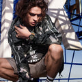 Armani Exchange's 46mm watch features a matte green camo dial with repeat logos and black stick indexes, a yellow second hand and date window for the day of the month, three-hand movement and brown stamped leather band.