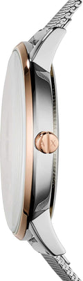 Just a touch of warm rose gold plating for this mostly all silver tone ladies watch by Armani Exchange. The 36mm wide case sits on top of an 18mm wide mesh bracelet with rose gold tone hands and hour markers. Water resistant 50m. Presented in official Armani Exchange packaging.
