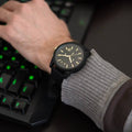 Sleek black silicone meets stainless steel in this chronograph watch set with a matching luggage tag. The 45mm case has a black dial with luminous markers. Water-resistant to 30 meters. A stylish travel companion—gift set perfection.