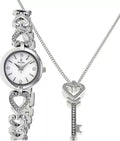 Stainless steel case with a stainless steel bracelet. Fixed stainless steel bezel. White dial with silver-tone hands and index hour markers. Dial Type: Analog. Quartz movement. Scratch resistant mineral crystal. Solid case back. Case diameter: 22 mm. Round case shape. Jewelry clasp. Water resistant at 30 meters / 100 feet. Functions: hour, minute, second. Additional Info: includes key pendant necklace. Dress watch style.