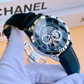 In stainless steel with domed metallized crystal, patterned black and grey dial, luminous hands and markers, 24-hour subdial, small sweep, screw-back case, black leather strap, and secure double-press deployant closure. Water resistance upto 30 metres. Case size 42 mm.