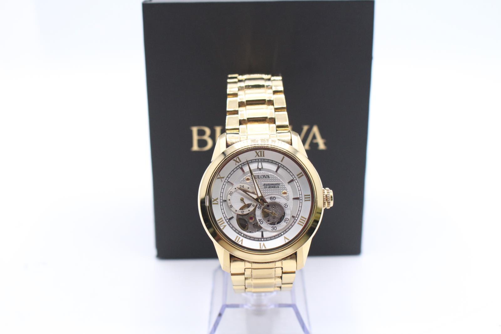 Bulova BVA Gold-Tone Stainless Steel Silver Skelton Dial Automatic Men's Watch 97A108. Insignificant Scratches on the Case and bracelet due to storing and Handling. This Beautiful Timepiece is Powered by Mechanical (Automatic) Movement And Features: Round Gold-Tone Stainless Steel Case & Bracelet, Fixed Gold-Tone Stainless Steel Bezel, Silver Dial with Luminous Gold-Tone Hands & Index Hour Markers Roman Numeral Hour Markers Set Along the Rim, Small Seconds Sub-Dial, 24 Hour Sub-Dial. Original Box and Bulova manuals Included.