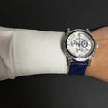 Stainless steel case. Rubber strap. Silver dial. Swiss quartz movement. Date. Chronograph. Water resistant 50 meters. Case 45mm.