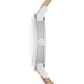 • Silver-tone dial with hydraulic-stamped check pattern, silver-tone applied stick indices, three hands and date window