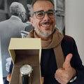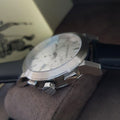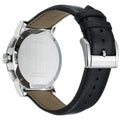 Stainless steel case with a black leather strap. Fixed bezel. Silver dial with silver-tone hands and index hour markers. Minute markers around the outer rim.