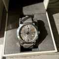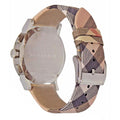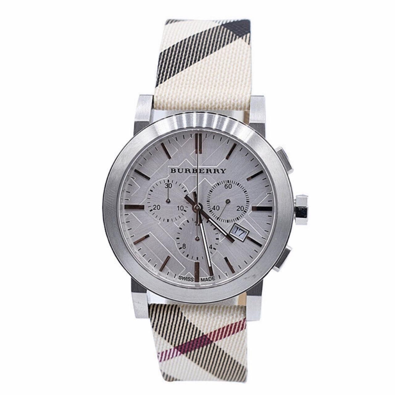 Burberry Quartz Chronograph # BU9357. Band Color: Beige. Case Material: Stainless Steel. Dial Color: Silver. Clasp Type: Buckle. Display Type: Chronograph. Bezel Material: Stainless Steel. Item Shape: Round. Bezel Function: Stationary. Band Material: Cloth. Crystal: Anti-Reflective Sapphire.