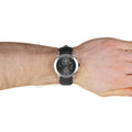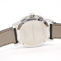 Stainless steel case with a black leather strap. Fixed stainless steel bezel. Grey dial with steel hands and index hour markers. Minute markers around the outer rim. Dial Type: Analog. Date display at the 4 o'clock position. Chronograph - sub-dials displaying: three - 60 second, 30 minute and 12 hour. Quartz movement. Scratch resistant sapphire crystal. Pull / push crown. Solid case back.
