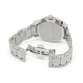Stainless steel case with a stainless steel bracelet. Fixed stainless steel bezel. Blue dial with silver-tone hands and index hour markers. Minute markers around the outer rim.