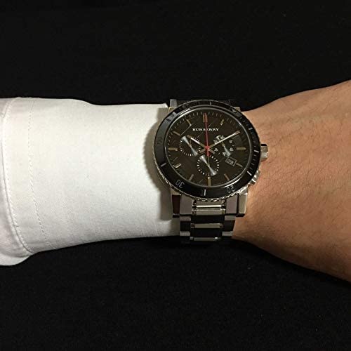 Solid case back. Case diameter: 42 mm. Case thickness: 11 mm. Round case shape. Deployment clasp. Water resistant at 50 meters / 165 feet. Functions: chronograph, date, hour, minute, second. Dress watch style. Watch label: Swiss Made. Burberry Black Dial Chronograph Stainless Steel Men’s Watch BU9380.