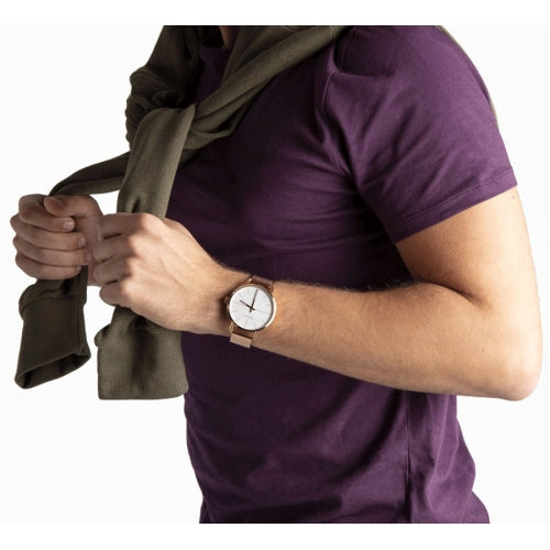 Rose gold PVD stainless steel case with a rose gold PVD stainless steel mesh bracelet. Fixed rose gold PVD bezel. Silver dial with rose gold-tone hands and index hour markers. Dial Type: Analog. Luminescent hands. Quartz movement. Scratch resistant mineral crystal. Pull / push crown. Solid case back. Round case shape. Case size: 42 mm. Case thickness: 9 mm. Band width: 18 mm. Fold over slip through clasp. Water resistant at 30 meters / 100 feet. Functions: hour, minute. Even Series. Casual watch style. Watch label: Swiss Made. Calvin Klein Even Quartz Silver Dial Ladies Watch K7B21626.