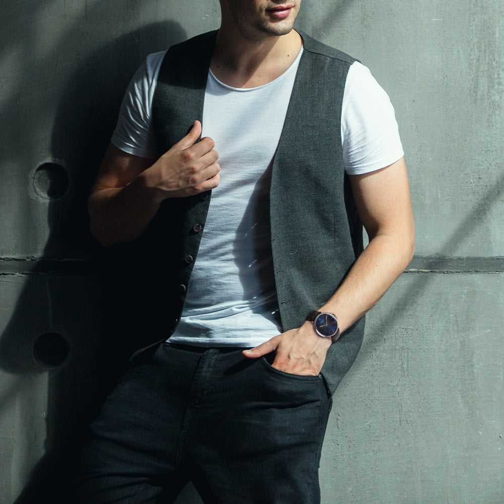 • watch in retro-modern style. The watch, with a blue dial, features simple and smooth lines with a curved crystal and a 43 mm diameter stainless steel case and a black leather strap secured with a buckle. Its movement is of quartz with silver hands with the white indicator.