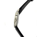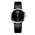 Stainless steel case with a black leather strap. Fixed stainless steel bezel. Black dial with silver-tone hands. Diamonds set at the 3, 6, and 9 o'clock positions