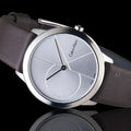 This unisex Calvin Klein Minimal watch has a stainless steel case and is fitted with a quartz movement. It is fitted with a black leather strap and has a silver dial.