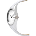 Stainless steel case with a white leather strap. Fixed stainless steel bezel. White and silver dial with silver-tone hands. No markers. Dial Type: Analog. Quartz movement. Scratch resistant mineral crystal. Pull / push crown. Solid case back. Round case shape. Case size: 29 mm. Case thickness: 6 mm. Band width: 8 mm. Tang clasp. Water resistant at 30 meters / 100 feet. Functions: hour, minute. Dress watch style. Watch label: Swiss Made. Calvin Klein Rebel Quartz White and Silver Dial Ladies Watch K8P231L6.