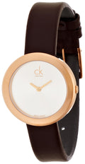 Rose gold-tone stainless steel case with a brown leather strap. Fixed rose gold-tone stainless steel bezel. Silver dial with rose gold-tone hands. Dial Type: Analog. Quartz movement. Scratch resistant mineral crystal. Pull / push crown. Solid case back. Case size: 29 mm. Round case shape. Water resistant at 30 meters / 100 feet. Functions: hour, minute. Dress watch style. Watch label: Swiss Made. Calvin Klein Firm Silver Dial Ladies Brown Leather Watch K3N236G6.