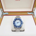 Blue dial with blue hands and index hour markers.