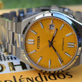 Under an anti-reflective sapphire glass, the sporty watch has a sunshine yellow dial with a date window at 3 o'clock and contrasting silver-colored details that highlight its classic aesthetic. Powered by an automatic movement and water-resistant to 50 meters, this stylish watch is suitable for everyday use at work, free time and everything in between. Caliber 8210.