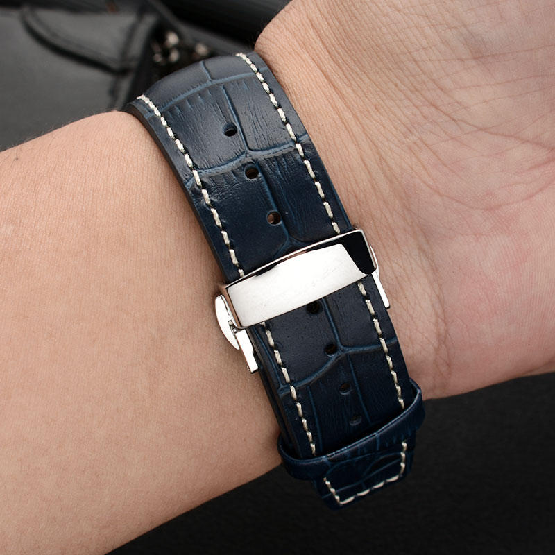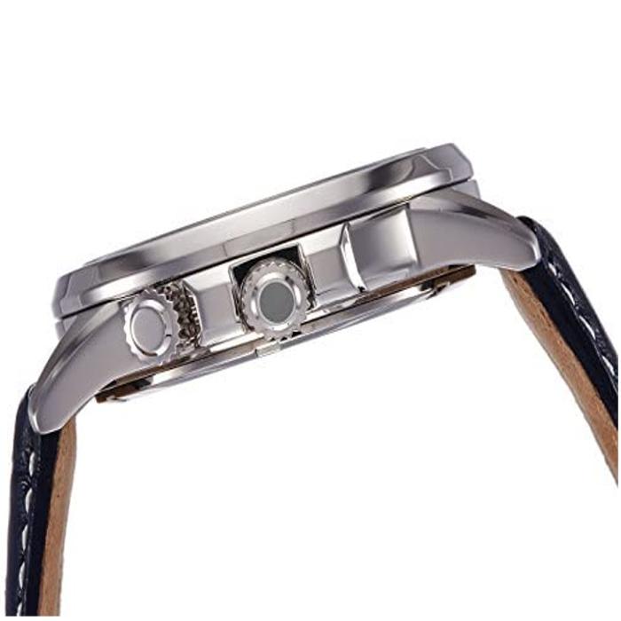 White dial enhanced by luminous blue hands. Silver-tone stainless steel case with a dark blue leather band. Eco-Drive movement. 100 meters / 330 feet water resistance. Fixed bezel. Scratch Resistant Mineral crystal. Solid caseback. Deployment clasp. Pull / Push crown. Case size 44 mm x 13 mm. Band 22 mm x 8 incheslong. Citizen BU2020-02A Calendrier Watch.