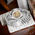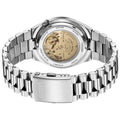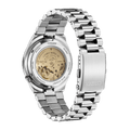 The watch features a date display under a sapphire crystal with a date magnifier, a skeleton case back that reveals the detailed mechanics, and a stainless-steel bracelet with a fold-over clasp and push button for added security. With a water resistance of 5 Bar, it is perfect for daily wear. This piece embodies CITIZEN's dedication to precision, elegance, and quality, making it a fitting choice for those who value both aesthetic beauty and functionality in their timepieces.