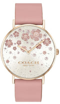 Gold-tone stainless steel case with a blush (calfskin) leather strap. Fixed gold-tone bezel. Floral glitter dial with rose gold-tone hands. No markers. Quartz movement. Scratch resistant mineral crystal. Pull / push crown. Solid case back. Round case shape. Case size: 36 mm. Case thickness: 7.5 mm. Band width: 18 mm. Tang clasp. Water resistant at 30 meters / 100 feet. Functions: hour, minute. Perry Series. Casual watch style. Coach Perry Quartz Floral Glitter Dial Ladies Watch 14503325.
