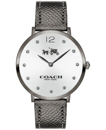 Stainless steel case with a grey leather strap. Fixed stainless steel bezel. Silver dial with grey hands and crystals hour markers. Dial Type: Analog. Quartz movement. Scratch resistant mineral crystal. Pull / push crown. Solid case back. Case size: 35 mm. Case thickness: 6 mm. Round case shape. Band width: 15 mm. Buckle clasp. Water resistant at 30 meters / 100 feet. Functions: hour, minute. Dress watch style. Coach Slim Easton Silver Dial Ladies Leather Watch 14502686.