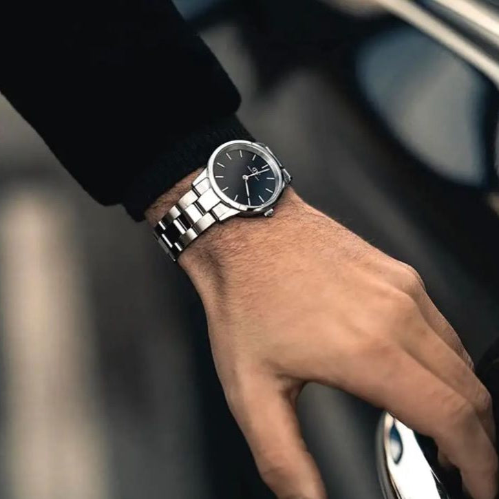The Iconic Link adorns a luxurious metal bracelet with three-piece links; each segment consists of tapered, individually crafted stainless steel parts - creating a seamless transition from the case to the clasp.