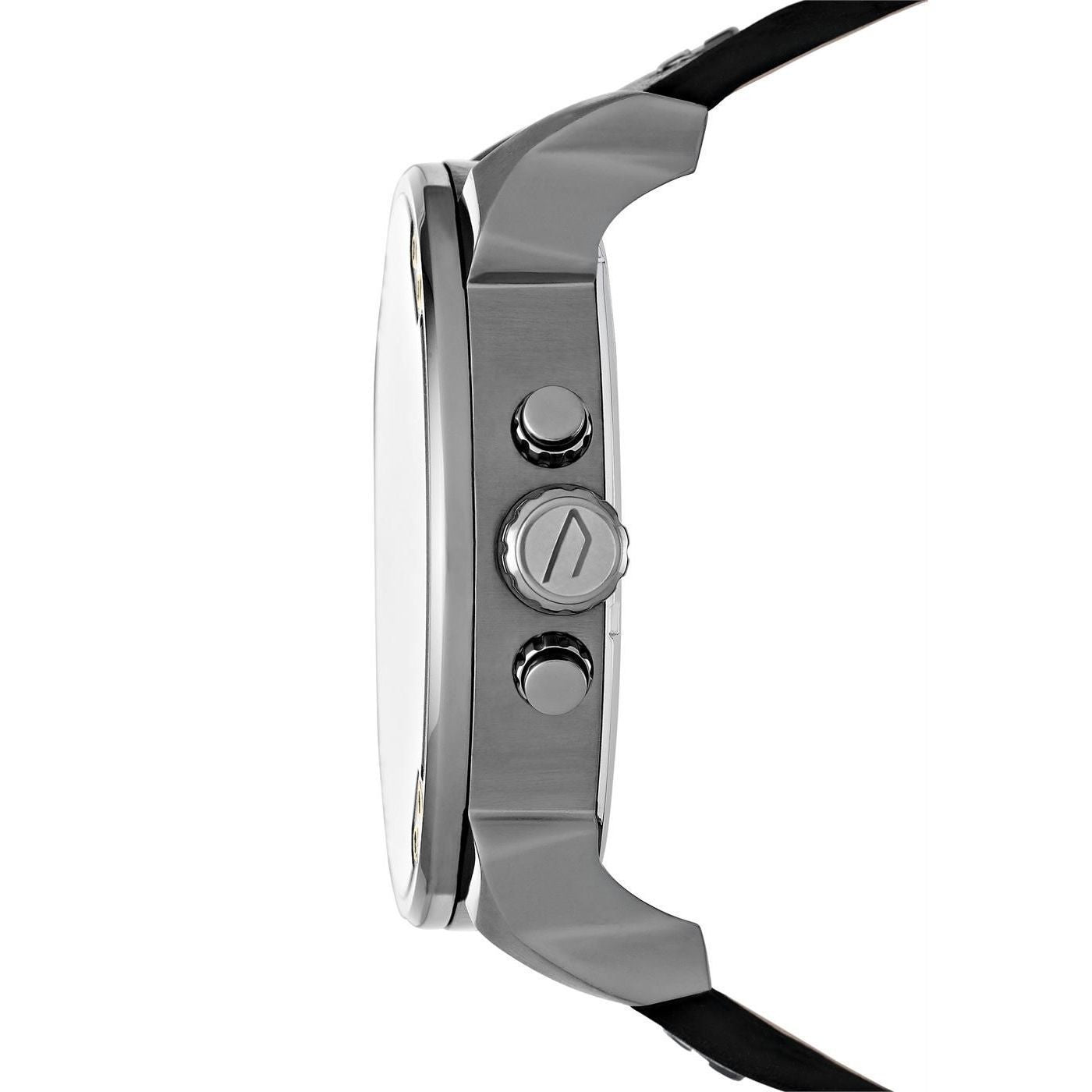 Black steel Strap. stainless steel case. black stainless steel bezel. black dial with Grey hands and Silver index hour markers. chronograph 4 time zones. quartz movement. mineral crystal. 57mmx 66mmx 14mm case. 28mm band width. 30 meters water resistant.