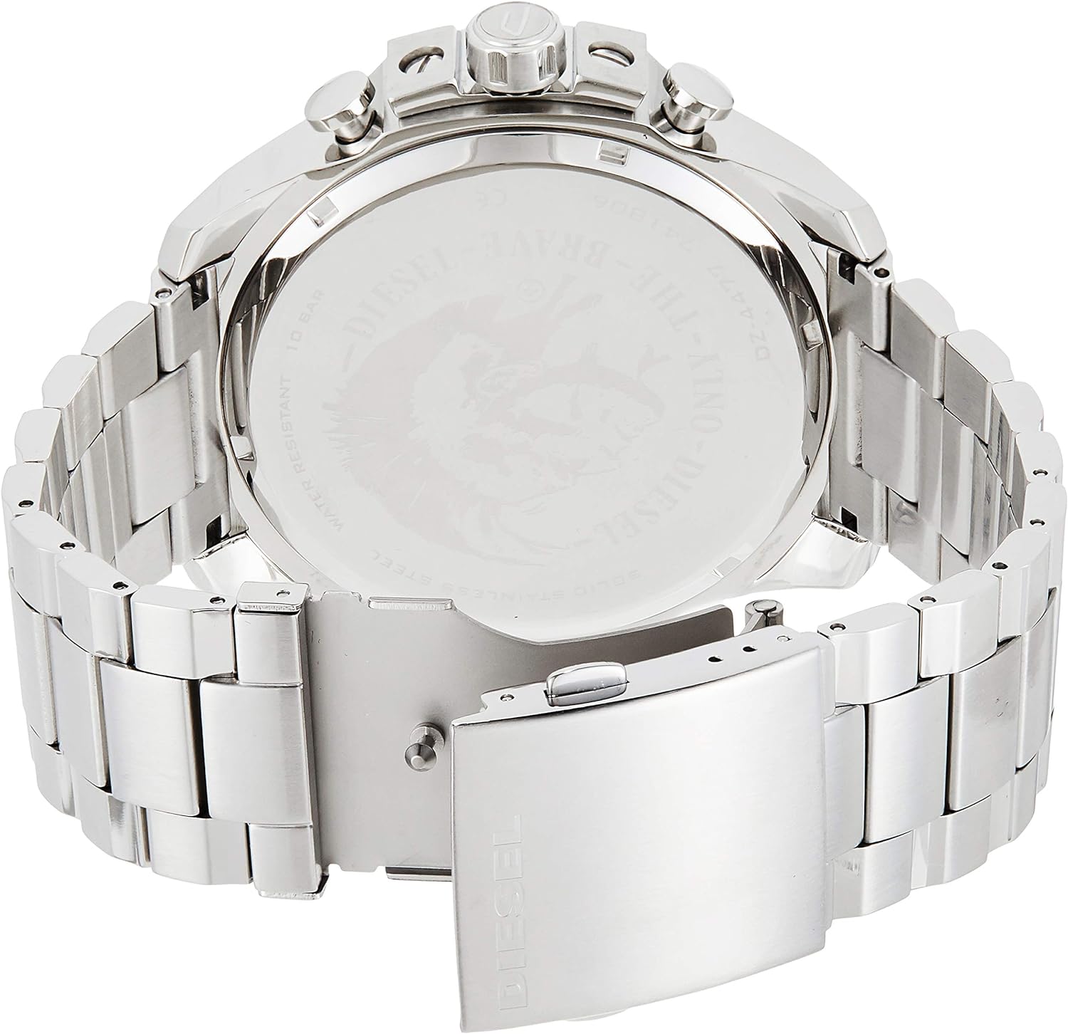 Mens Diesel DZ4417 Mega Chief Watch is made from stainless steel and has a large round case at 51mm wide. It has a blue dial which features high-visibility white baton hour markers and high-visibility hands. It has a date function and 3 mini dials which feature the chronograph function. It fastens with a stainless steel bracelet.