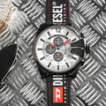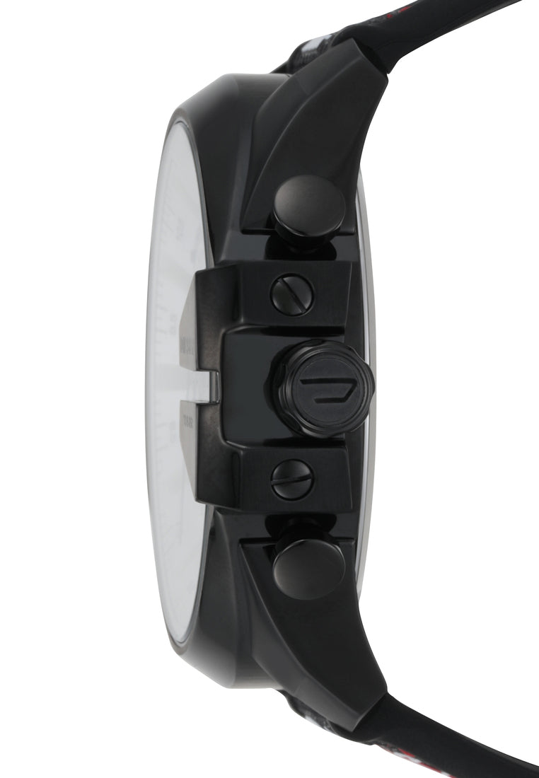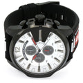 This 51mm Mega Chief watch features a silver dial with black indexes and black printed tracking, chronograph movement and black nylon and silicone strap with white and red Diesel logo detail.