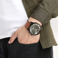 Be a leader, not a follower, in the black IP Diesel Mega Chief watch. The gray sunray chronograph dial features shiny black-and-gray indexes for edgy detailing, and an “Only the Brave” tag, while a brown leather strap with debossed construction completes the look.