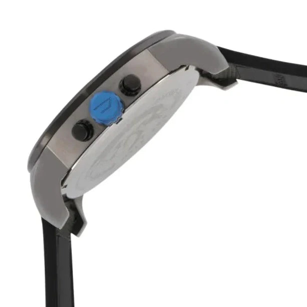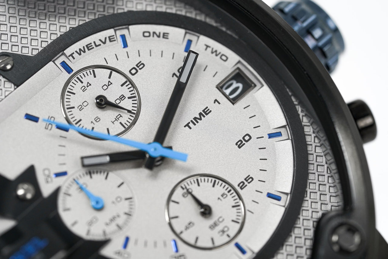 This 57mm Mr. Daddy 2.0 watch features a detailed gray dial with blue accents, chronograph movement and black-and-gray silicone and nylon strap.