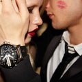 • Genuine black pebbled leather band with silver-tone screw accents and buckle closure