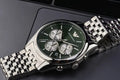 • This model exhibits a green sunray dial with silver hour, minute and second hands alongside three sub-dials.