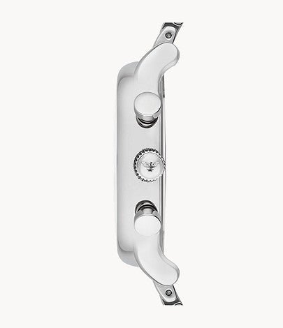 Stainless steel case with a stainless steel bracelet. Fixed stainless steel bezel. Black dial with luminous silver-tone hands and index hour markers. Minute markers around the outer rim. The Emporio Armani logo at the 12 o'clock position. Dial Type: Analog. Luminescent hands and markers. Date display between the 4 and 5 o'clock positions. Chronograph - three sub-dials displaying: 60 seconds, 30 minutes, and 24 hours. Quartz movement. Scratch-resistant mineral crystal. Pull/push crown. Solid case back. Case diameter: 41 mm. Case thickness: 12.3 mm. Round case shape. Band width: 20 mm. Fold-over clasp. Water-resistant at 50 meters / 165 feet. Functions: chronograph, date, hour, minute, second. Casual watch style. Emporio Armani Chronograph Black Dial Stainless Steel Men's Watch AR1853.