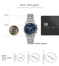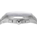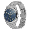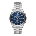 Emporio Armani's 42mm watch features a blue sunray textured dial, chronograph movement, stainless steel case and stainless steel bracelet.