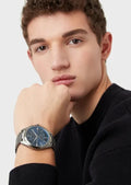Emporio Armani's 43mm watch features a blue sunray dial with applied indexes and hands with white luminova, at least 50% recycled gunmetal stainless steel case, chronograph movement and gunmetal at least 50% recycled stainless steel bracelet.