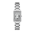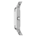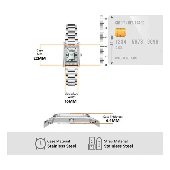 An elegant and refined timepiece, the rectangular stainless steel case is enhanced by dazzling crystal accents, creating a sophisticated sparkle that draws attention to its luxurious appearance. The clean, minimalist dial features the iconic Emporio Armani eagle logo, complemented by slim hour markers and sleek hands, offering a timeless and modern appeal.