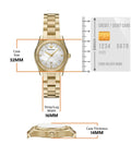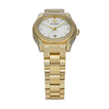 This 32mm watch features a glossy, white mother-of-pearl dial, three-hand date movement, and a gold-tone stainless steel bracelet. The fluted gold-tone stainless steel bezel adds an element of visual intrigue, making the perfect complement to the structured watch case and bracelet.