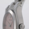This 32mm watch features a striking pale pink dial, three-hand date movement, and a stainless steel bracelet. The fluted stainless steel bezel adds an element of visual intrigue, making the perfect complement to the structured watch case and bracelet.