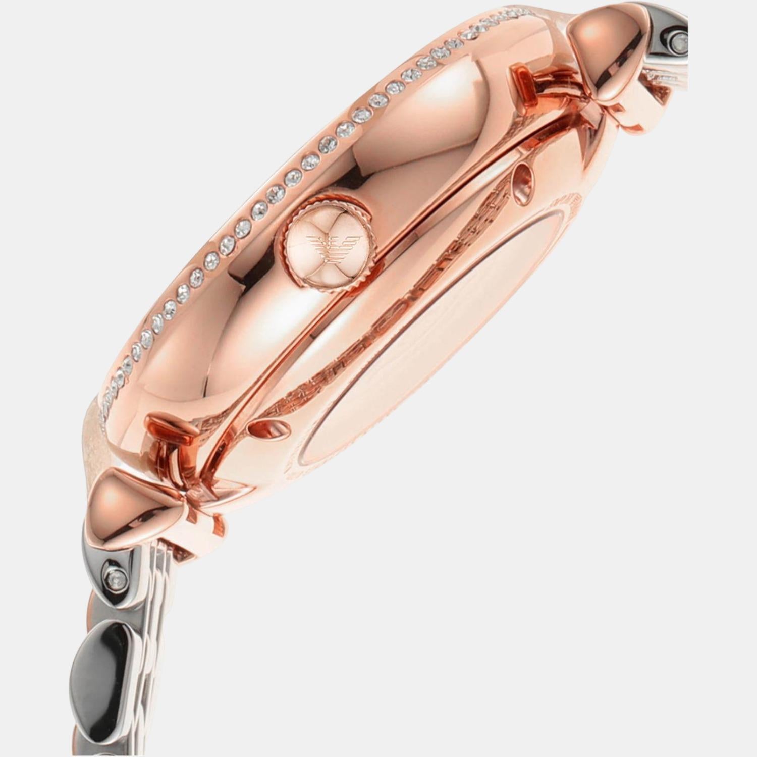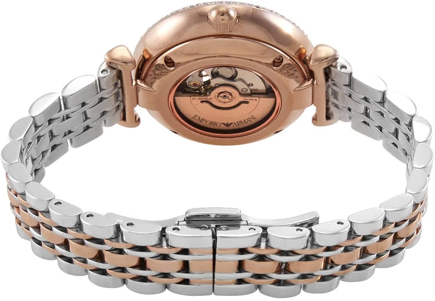 Emporio Armani watch with 34mm diameter case with three-hand movement Silver sunray dial with rose gold-tone roman numerals and bar indices and see through skeleton subdials coupled with glitz top ring and stainless steel bracelet with rose gold-tone center links.