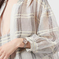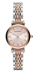 The Ladies Silver & Rose Gold Stainless Steel Emporio Armani Watch is a stunning ladies watch. This watch has a 28mm rose gold stainless steel case with an analogue display. The watch has a brush pink dial with a silver & rose gold two-tone stainless-steel strap and is powered by Quartz movement. The watch is water resistant up to 30 meters and comes with a 2-year guarantee.