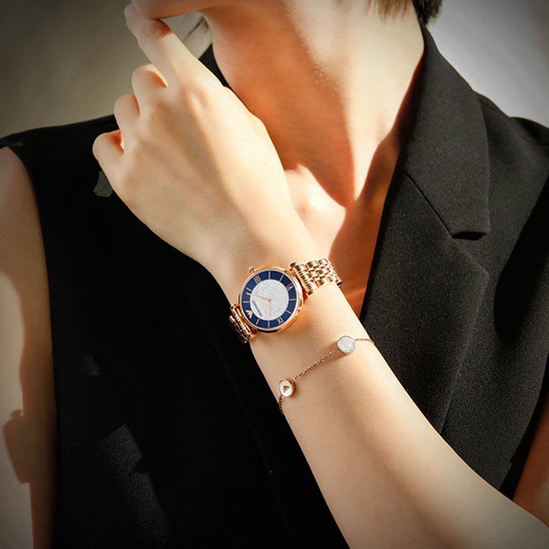 It has a blue and sparkling stone set analogue dial with rose gold tone hands & roman numerals which are protected beneath a mineral crystal glass. Power is generated by the quartz movement. This model also has a water resistance of up to 30 metres.