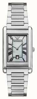 Emporio Armani's 25 x 38mm stainless steel watch is distinguished from the crowd. Featuring a sleek rectangular case and a two-hand date quartz movement, this timepiece stands out with its glossy mother-of-pearl dial adorned with Roman numeral indexes. The stainless steel H-link bracelet adds a touch of refinement, making it perfect for any dress occasion.
