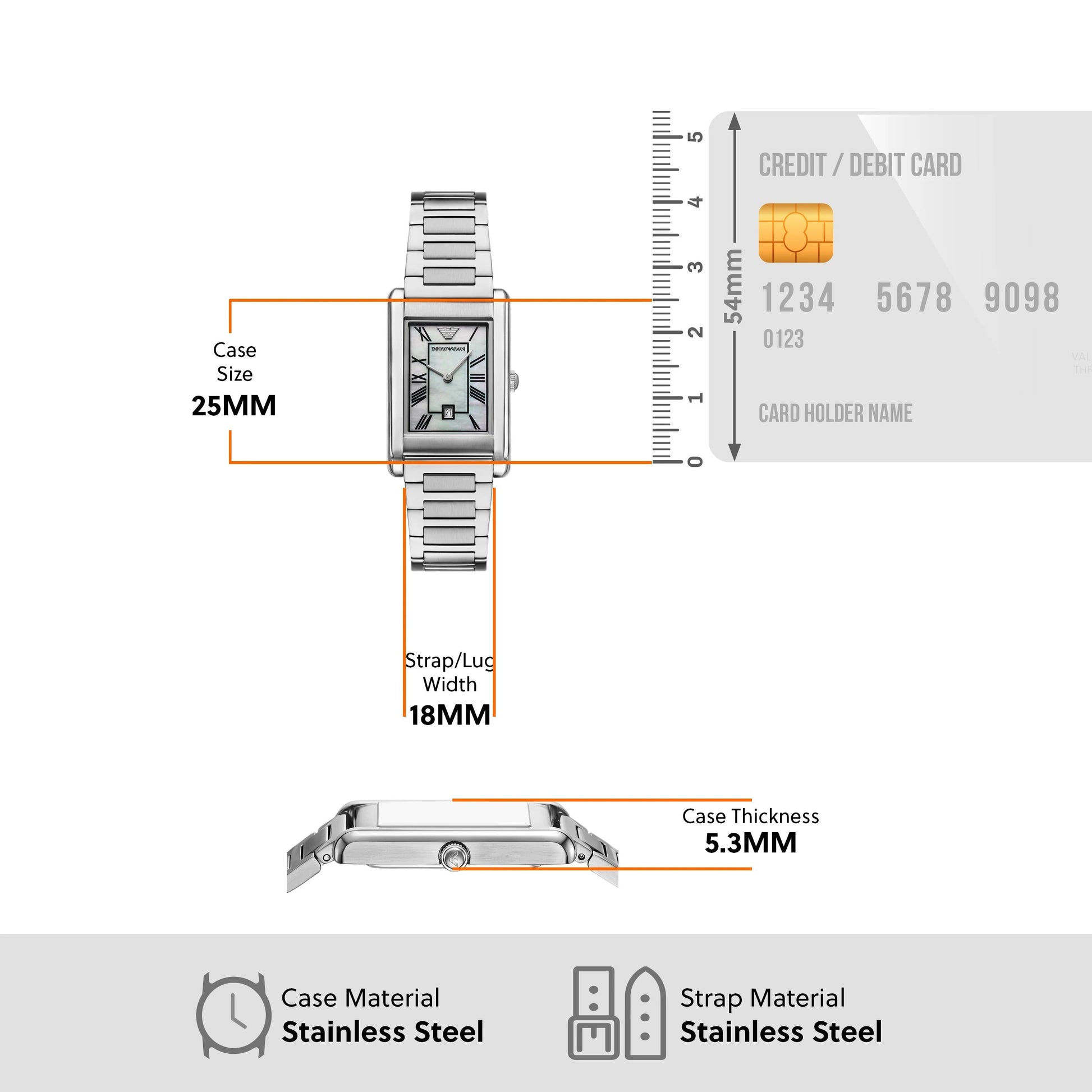 • Emporio Armani's 25 x 38mm stainless steel watch is distinguished from the crowd. Featuring a sleek rectangular case and a two-hand date quartz movement, this timepiece stands out with its glossy mother-of-pearl dial adorned with black Roman numeral indexes. The stainless steel H-link bracelet adds a touch of refinement, making it perfect for any dress occasion.