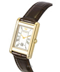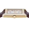 • A rectangular gold-tone stainless steel case frames the dial. The case measures 25mm in diameter.